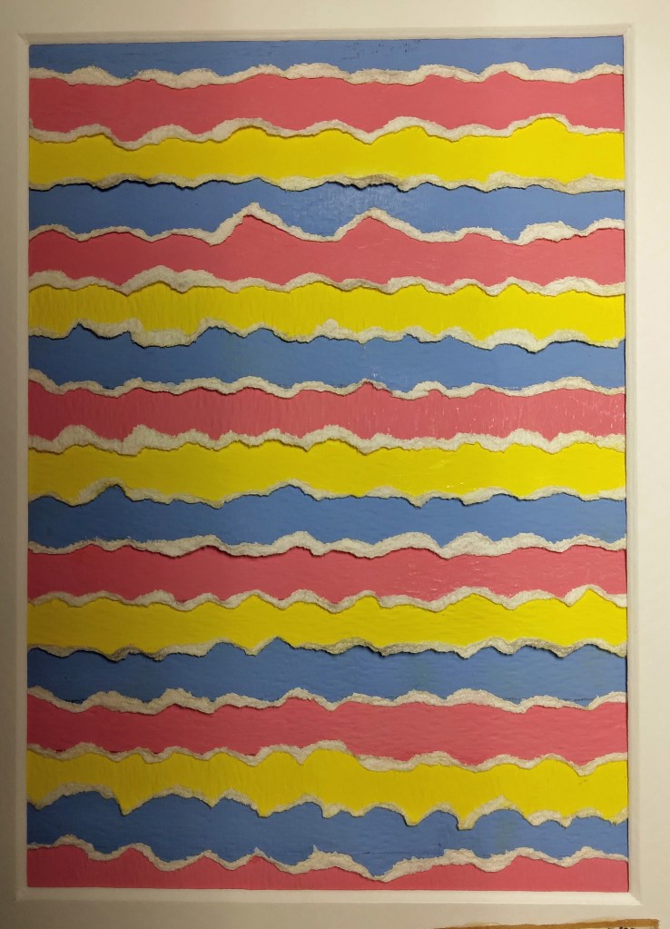 The one piece I remember very well actually was a non-representational collage and it completely absorbed me. I remember going to the art supply store and selecting very specific tempera paint colors. At night, I sat at our dining room table making this piece and my husband sat across from me painting miniature historic figurines. I painted several sheets of small, fairly thick watercolor paper a variety of pastel colors: pink, blue, and yellow. After I painted the paper, I painstakingly tore them into long strips and then spent a great amount of time collaging them, looking carefully at the tear pattern of each strip of paper and deciding if it was the best choice to go with the previous strip’s tear pattern. It took me a long time to complete this piece and it was very small. After it was finished, I bought a precut blue mat (overall size 10″ x 8″) that had a white liner mat, which I signed. I called the piece Post Partum. Over the years I framed it different ways but I think my favorite presentation was the original one in the inexpensive humble precut mat and ready made silver chrome frame. I still have the piece (see below)
