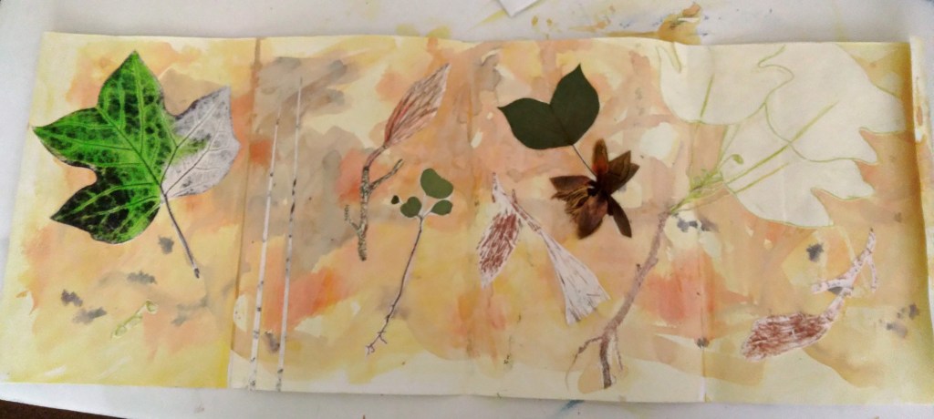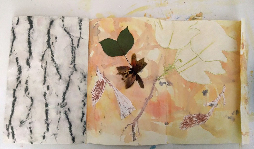 Above is the inside with the pages unfolded. It is a mixture of dried plants, drawings, rubbings, and collage.