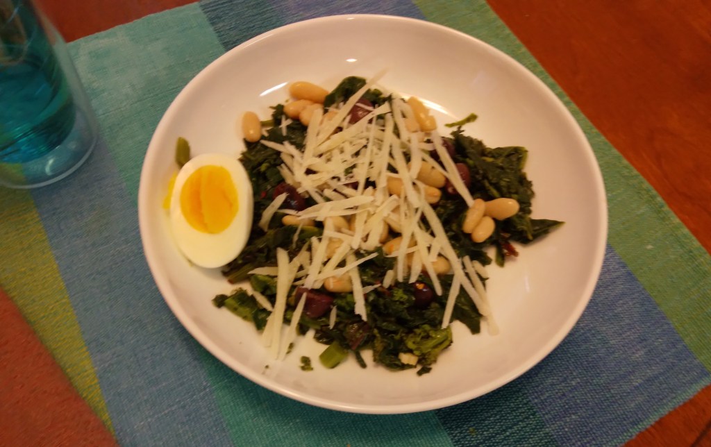 So what is this? It is Broccoli Rabe (known some places as Rapini) topped with kalamata olives, cannellini beans, a little bit of course shredded pecorino and a hard boiled egg half. It is dressed very lightly with olive oil, garlic, oregano, basil and a dash of red pepper flakes.