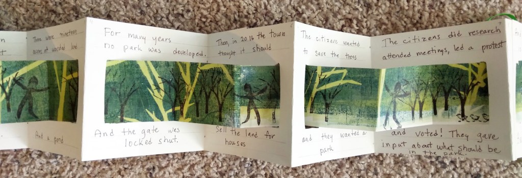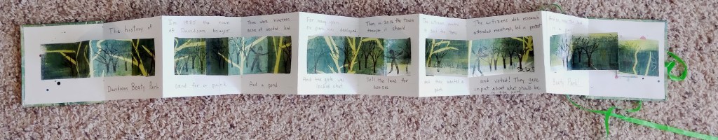 Yesterday I met my friend Alice to go letterboxing, which we do occasionally. As we were getting started, Alice wanted to show me somethings she recently made. One was a book about a park in her neighborhood. When I met Alice, she was working very hard on a committee trying to save the park from bulldozers and they were successful. I was not surprised that they were successful, but I was very surprised and moved when Alice presented me with the book!! It is a very complex double accordion book with windows. To represent the park, Alice used a tree stamp over a gelatin print. It is very lush because the layers are built up and you get a sense of being in the woods. Figures dance among the trees and three tiny birds observe. The book is playful and joyous which is no doubt how people will feel at this park. The text gives a brief overview of the history of the park. I felt so very touched to receive such a special gift. The full book is spread out below and I have a detail underneath. My photos do not do it justice.