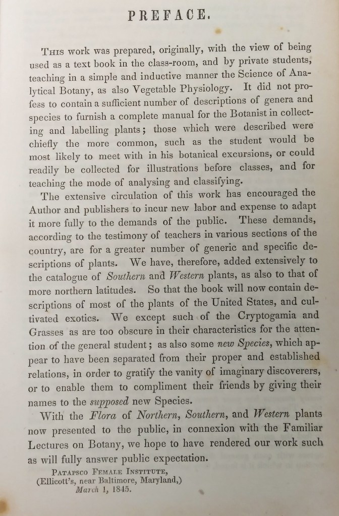 I came across this book on one of the herbarium shelves, and, being very attracted to the binding and typeface, picked it up immediately. The image at the top shows the title page Lectures on Botany, by Mrs. Lincoln (as written on the spine of the book). Mrs. Lincoln was the principal at the Patapsco Female Institute of Maryland and author of books on natural history. I decided to read the preface of the book where she discusses, among other things, what she choose to exclude from this text. I almost fell over laughing at the part I have underlined in red below where she writes :