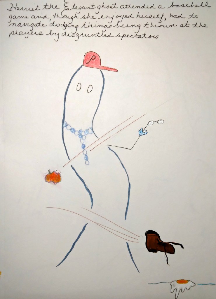 Harriet the Elegant ghost attended a baseball game and, though she enjoyed herself, had to navigate dodging things being thrown at the players by disgruntled spectators.
