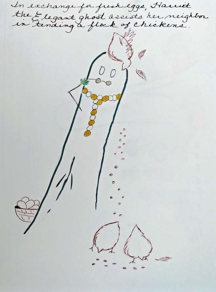 Harriet Fights Inflation – part 2 Posted byDianeOctober 21, 2022October 19, 2022Posted inArtTags:cartoon series, cartoons, Chickens, Farm animals, fictional characters, ghosts, harriet the elegant ghost, Inflation, social commentary Harriet Fights Inflation – Tending Chickens In exchange for fresh eggs, Harriet the Elegant ghost assists her neighbor in tending a flock of chickens. Share this: Click to share on X (Opens in new window) X Click to share on Facebook (Opens in new window) Facebook Click to share on Pinterest (Opens in new window) Pinterest Click to email a link to a friend (Opens in new window) Email Like Loading... Related