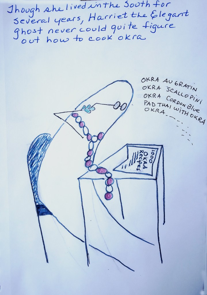 Though she lived in the South for several years, Harriet the Elegant ghost never could quite figure out how to cook okra.