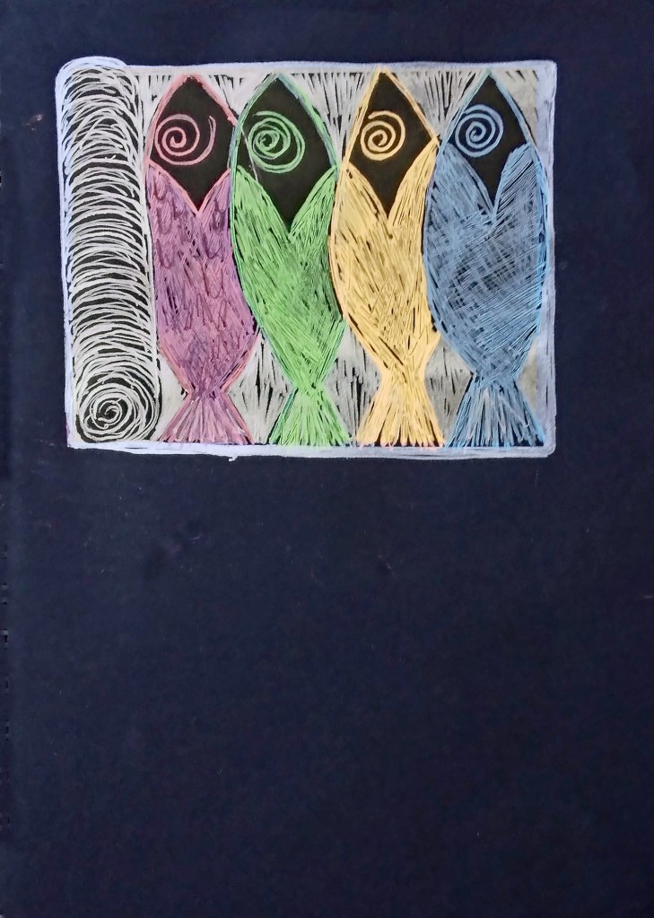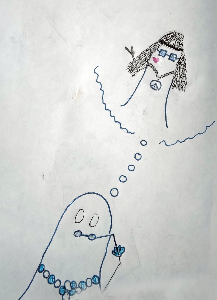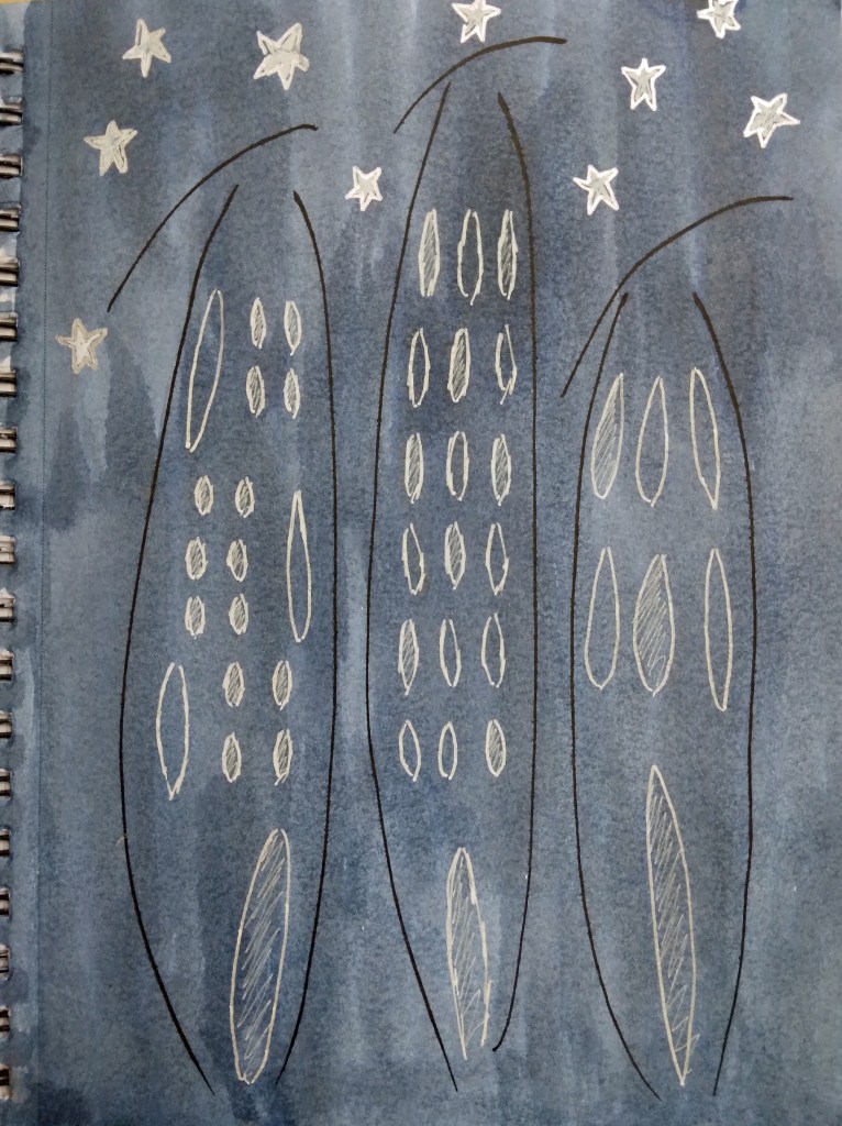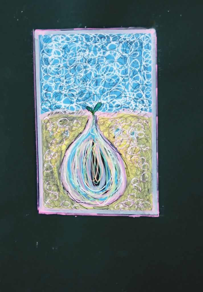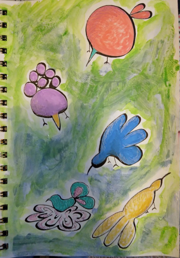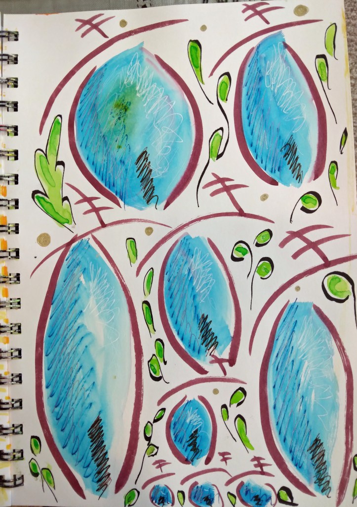 A doodle book is just that – doodles. It is something I sit with in front of the TV or at my desk and draw faces, shapes, designs in my head, just whatever comes to mind. I have filled whole pages with circles, lines, puffy cloud shapes, etc. They are just for fun. If I am at my desk, I often become a bit more adventurous and break out collage materials and messier paint media. Often, ideas develop from these doodles. I think Harriet started as a doodle. Now she has taken over my life! Below and above are samples from my doodle books and I believe I have posted many images from my doodle books over the past few years. Some links for the curious: Link 1 Link 2 Link 3