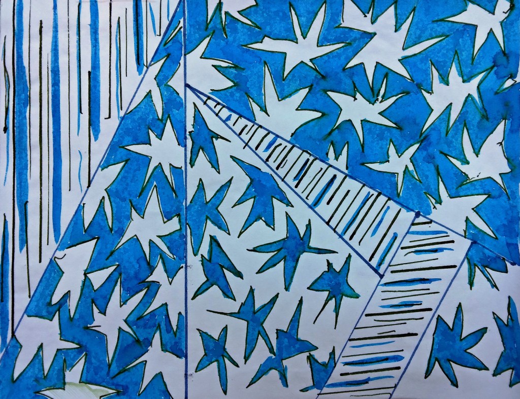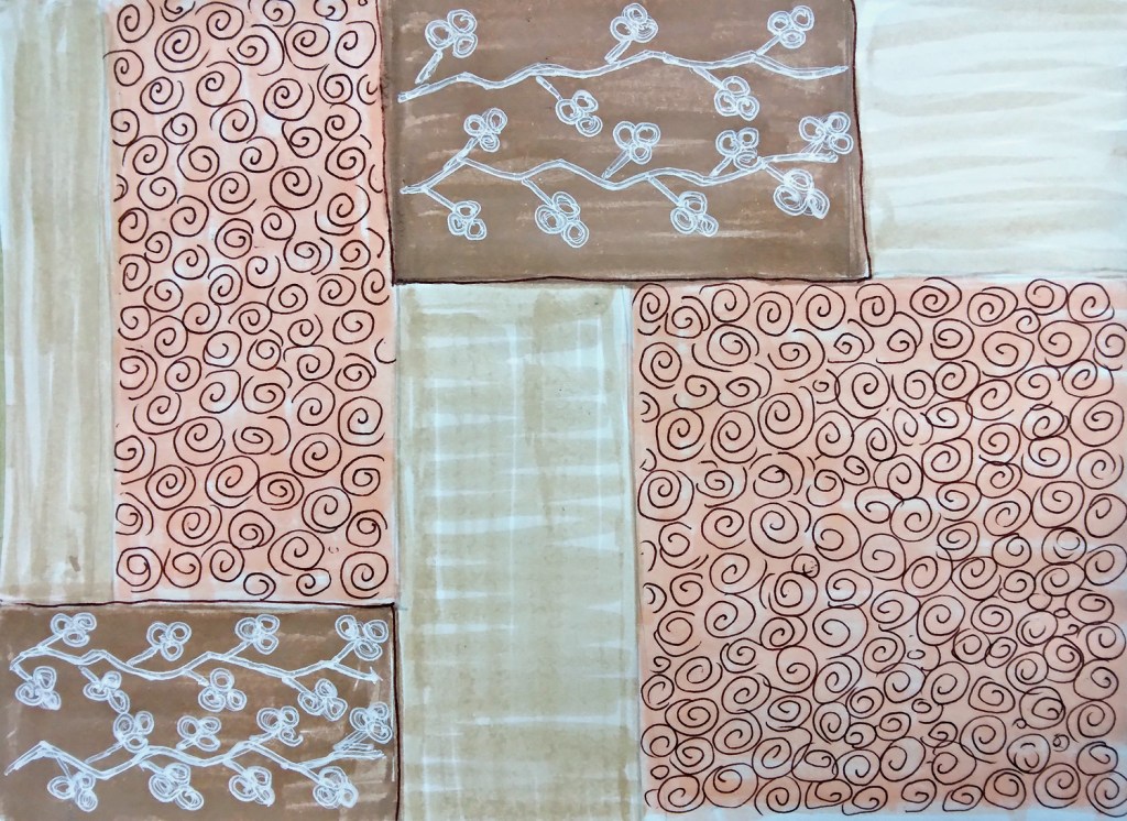 I was not using the sketch book pages opposite of the collaged quilts because I didn’t want the designs and textures to compete with one another. But they looked lonely and empty. I then got it in my mind to make drawings of the collages. Not exact replicas but something that would mimic the designs. As mentioned in my post about the collages, my focus is on minimalism as well as design. Below are the drawings I have done so far and I have them pictured next to the quilt they are mimicking.