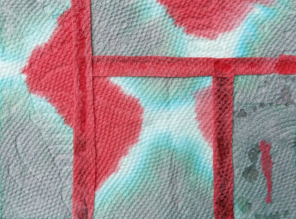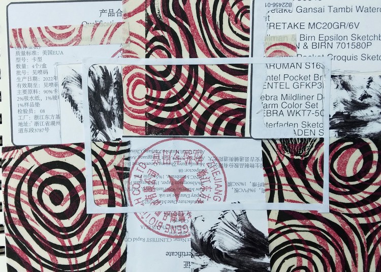And the resulting collage-quilt is below, enhanced with some brush pens filled with fountain pen ink: