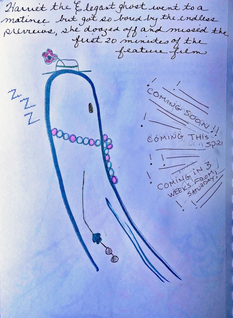 Harriet the Elegant ghost went to a matinee but got so bored by the endless previews, she dozed off and missed the first 20 minutes of the feature film.